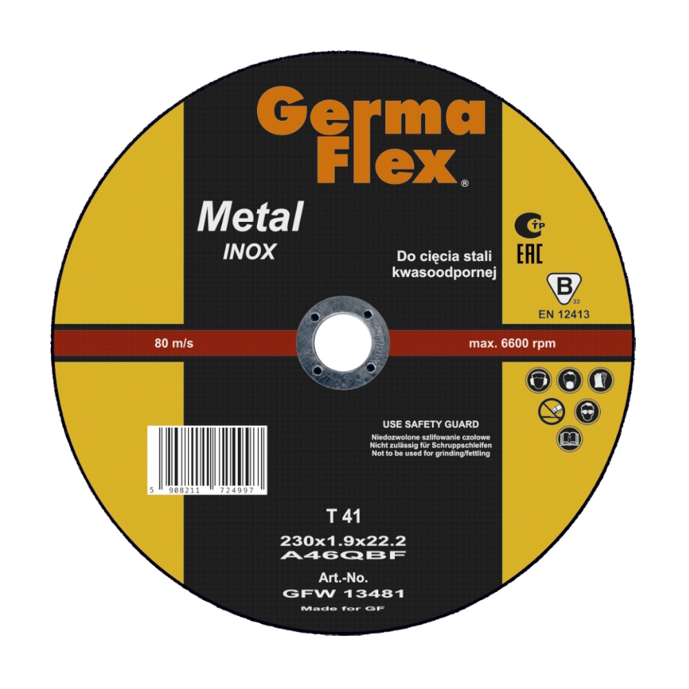 Skæreskive til skæring af rustfrit stål (INOX) og andre hårde metaller, fremstillet af elektrokorund og er helt fri for svovl og jern.