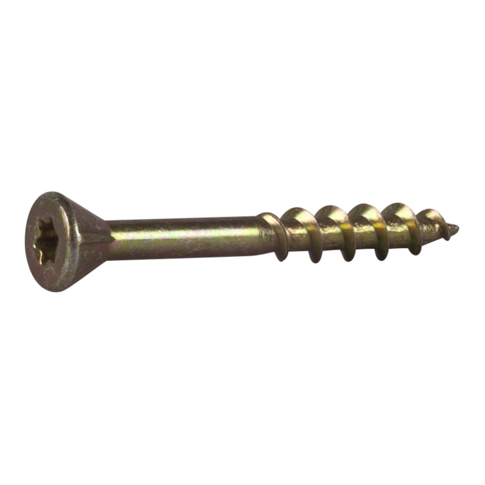 Skruen er lavet af hærdet stål og har en gulkromateret overfladebehandling. Den er udstyret med et TX-stik. Hovedet er udstyret med skæreriller, der forsænker skruen og efterlader en glat overflade uden grater.