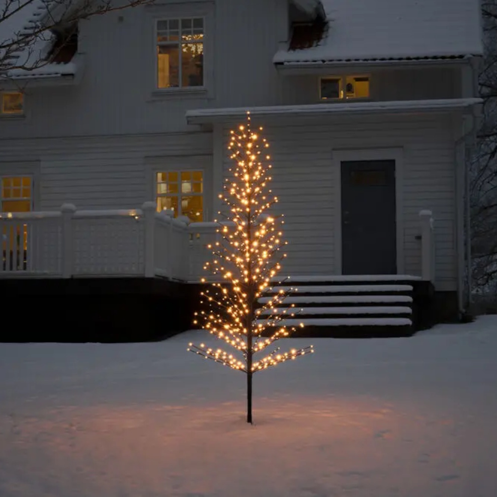 Sort dekorativt træ fra Konstsmide med 5040 ravfarvede LED-lys. Strømledning 5 m. Til udendørs brug. Dette lystræ er en perfekt løsning til at skabe en hyggelig atmosfære i din have eller på din terrasse. Med sin højde på 2100 mm og bredde på 850 mm vil det være et imponerende element i din udendørs indretning. Træet er lavet af robust metal og plastik, hvilket gør det holdbart og klar til at modstå elementerne.
