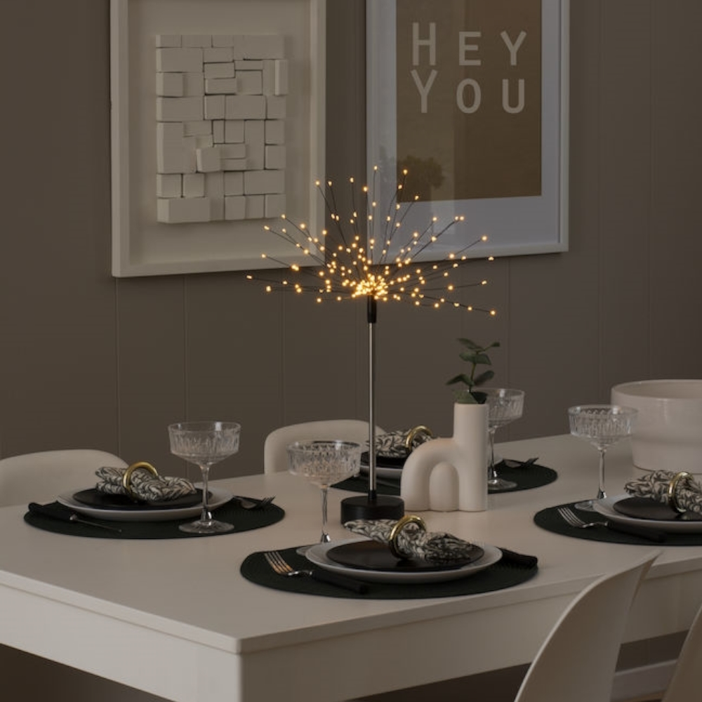 Borddekoration til indendørs brug i metal med hvid base. 160 gule LED-lys. Drevet af 3xAA-batterier (medfølger ikke) har den en timerfunktion på 6 timer.