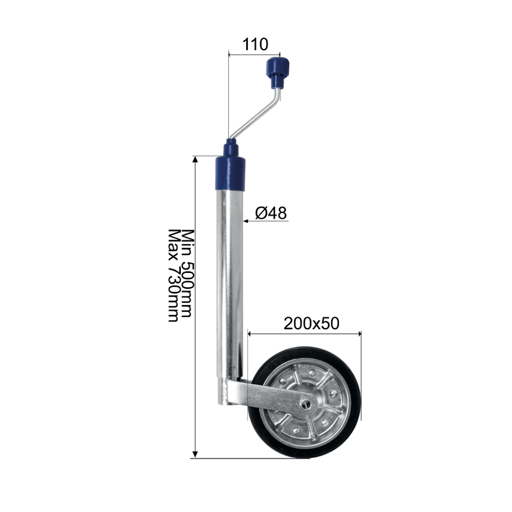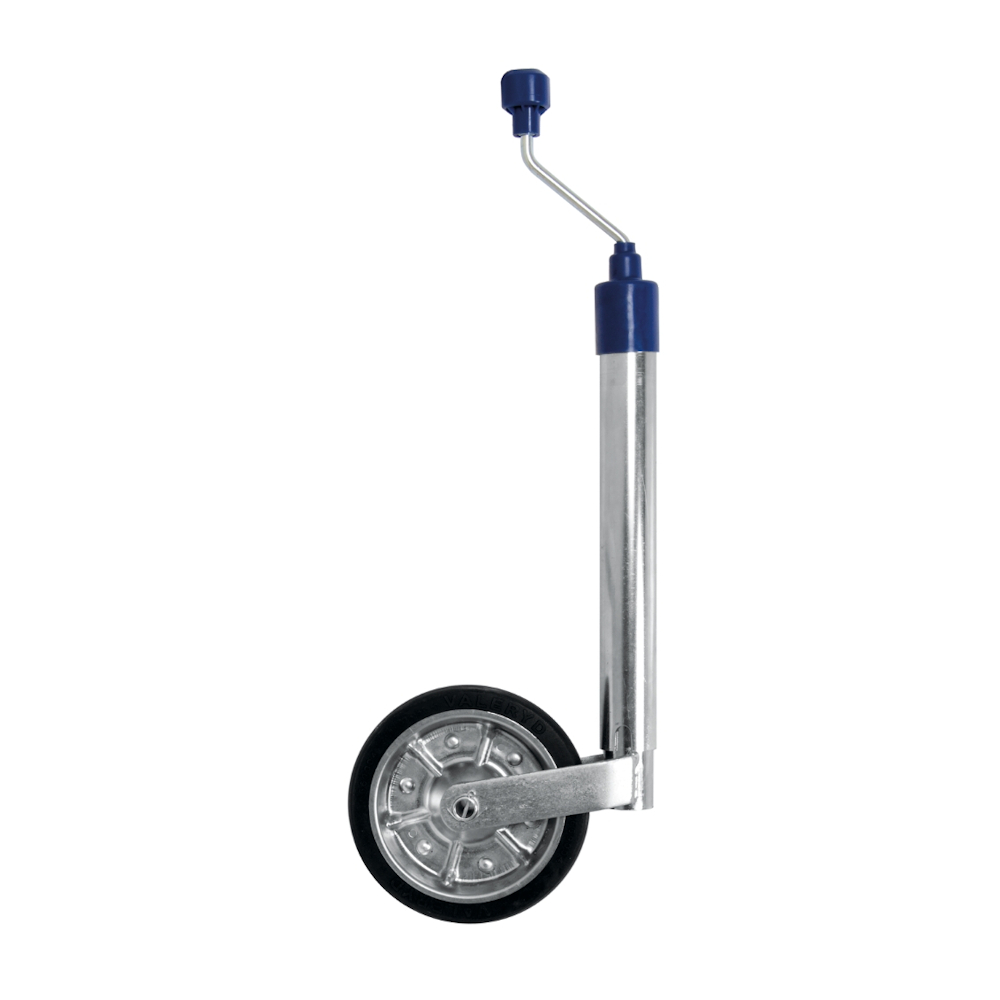 Støttehjul. Diameter 48 mm blå stålfælg. Massive gummihjul for at undgå punkteringer. Blå gummikappe på stangen for at forhindre vand og snavs i at trænge ind. Dette støttehjul passer til de fleste bremsede og ubremsede personbiltrailere.