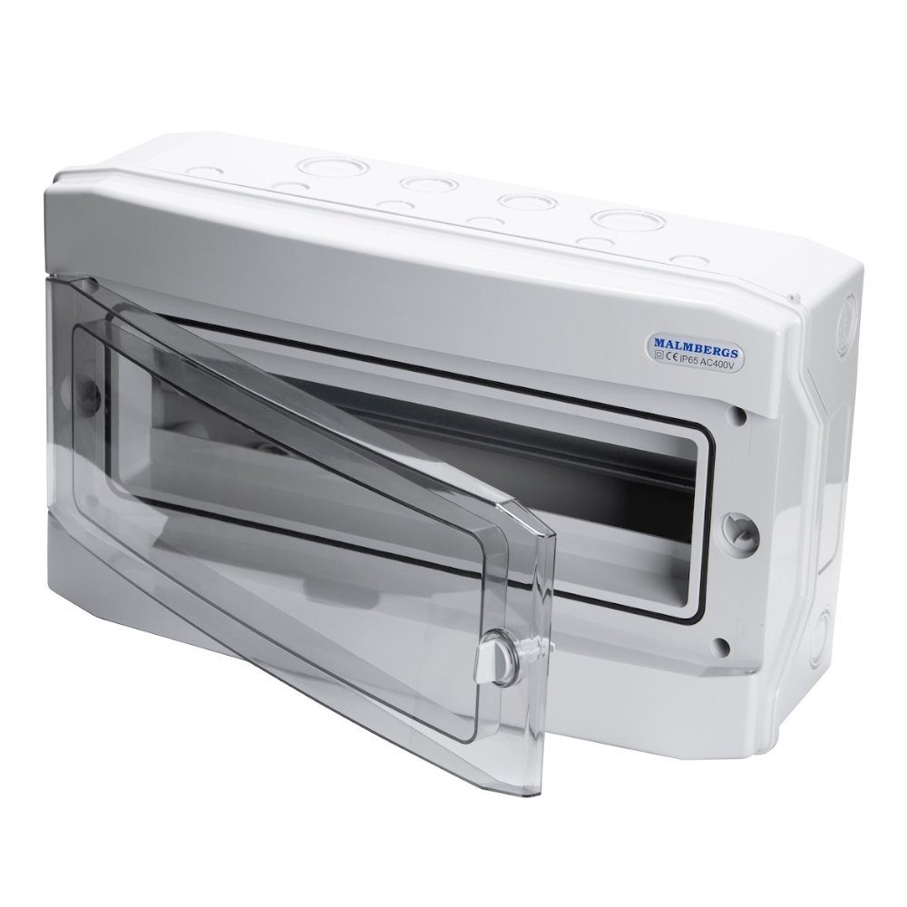 Halogenfri standardkabinet fremstillet af UV-bestandig, slagfast og selvslukkende ASA-plast 650°C. Bagpanelet er fuldt dækket og har udslagshuller til indgående kabler og rør. Leveres komplet med røgfarvet dør og neutral- og beskyttelseslederskinner fremstillet af polyamid 960°C. Til kabinetter fra 8 moduler og opefter medfølger 6 moduldæksler. Dørlåse fås som tilbehør.