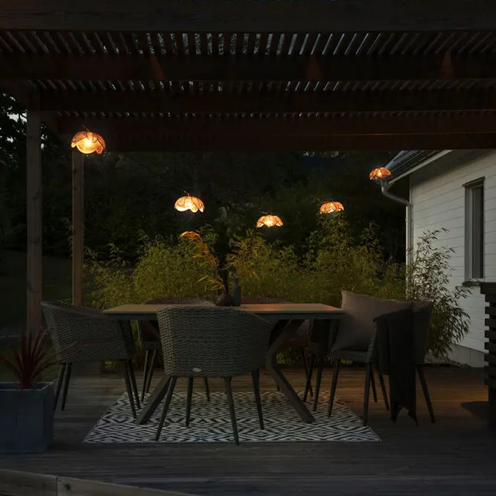Festkæde til terrassen eller orangeriet med 10 ravfarvede LED'er og dekorativ rottingskærm. Har indbygget lysdæmper. [Energiklass G]
