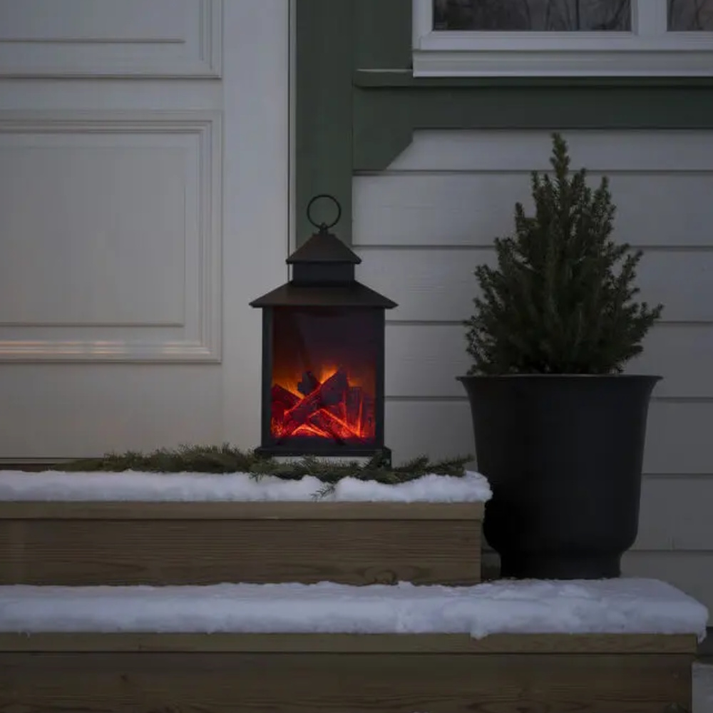 Dekorativ lanterne med pejseffekt til indendørs/udendørs brug, drevet enten med en 4,5V transformer, har en timerfunktion på 8 timer.