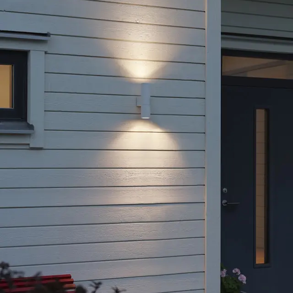Temi, en elegant facadebelysning i hvidlakeret aluminium med struktur og klart glas, lyset er rettet opad og nedad.