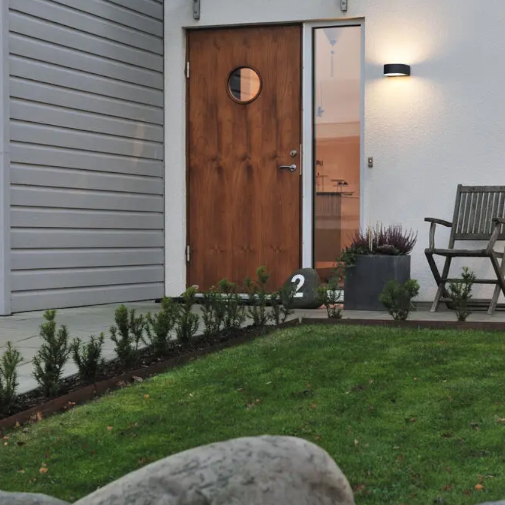 Teramo, minimalistisk facadebelysning designet til at sprede lys både opad og nedad, sortlakeret aluminium med frostet glas.