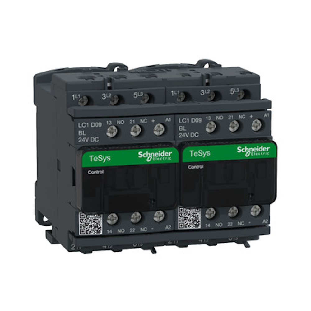 TeSys D reverserende kontaktor, 3 polet (3 normalt åbne), til motorstyringsapplikationer op til 9A/690V AC-3 (4kW/400V). Den har lavt forbrug af 24V DC-spoler med transientbeskyttelsesmodul, 2 normalt åbne + 2 normalt lukkede indbyggede hjælpekontakter (NC spejlkontakter), tilslutning via skrueterminaler. Til driftshastigheder op til 3600 cykler/timen og omgivelser op til 60°C, tilbyder den høj pålidelighed og holdbarhed. Kompakt (90mm bred), DIN-skinne montering eller skruefastgørelse. Med forbundet reverseringsstrømforsyning, mekanisk lås (uden elektrisk låsning). Multi-standard certificeret (IEC, UL, CSA, CCC, EAC, Marine), Green Premium-kompatibel (RoHS/REACh).
