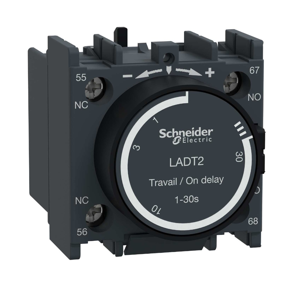 TeSys Deca tidsforsinket hjælpekontaktblok, til kontaktorer LC1D, LC1F og styrerelæer CAD. Den leverer 1NO+1NC kontakter klassificeret op til 10A 690V AC, indstillingsområde for indkoblingsforsinkelse 1-30s, tilslutning via skrueklemmeterminaler. Klipsmontering foran, den sikrer høj pålidelighed og holdbarhed. Certificeret i henhold til flere standarder (IEC, UL, CSA, CCC, EAC), Green Premium-kompatibel (RoHs/Reach).