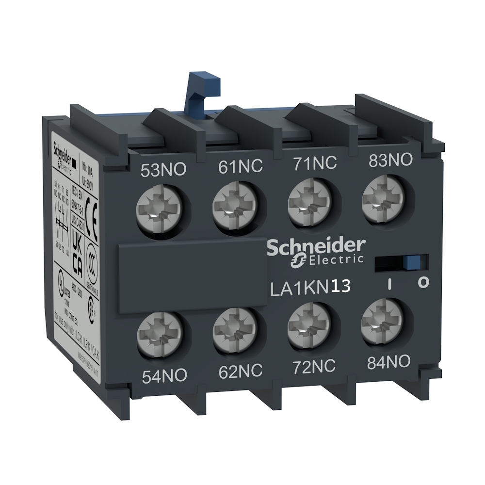 TeSys K øjeblikkelig hjælpekontaktblok, til kontaktorer LC.K, LP.K, CA.K med skrueklemmer (undtagen LP4K, LP5K, CA4K). Den giver 1NO (normalt åben)+3NC (normalt tæt) kontakter klassificeret op til 10A 690V AC, forbindelse med skrueklemmeterminaler. Frontmontering med clip-on giver høj pålidelighed og holdbarhed. Multistandarder certificeret (IEC, UL, CSA, CCC), Green Premium-kompatibel (RoHS/REACh).