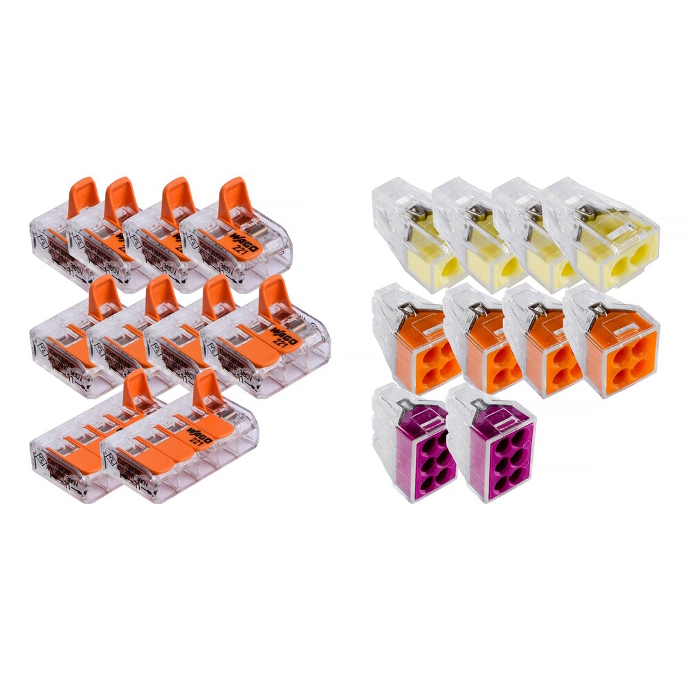 En blanding af Wago tilslutningsterminaler, praktisk sæt med i alt 20 terminaler i forskellige størrelser.