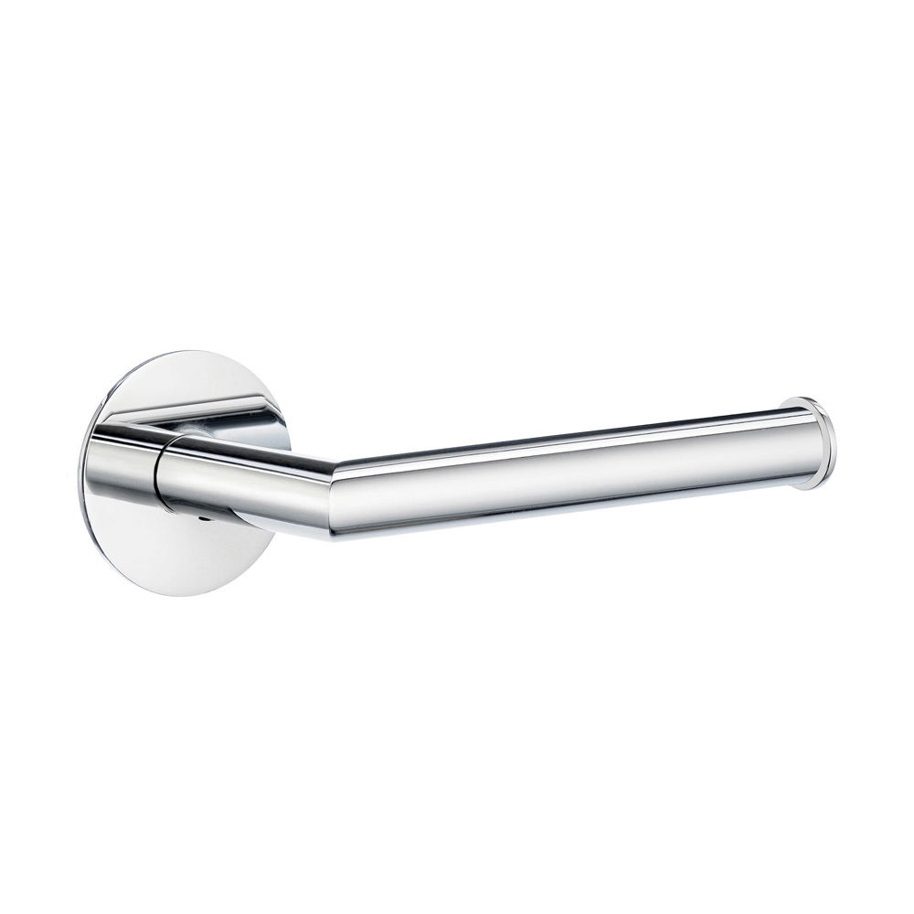 Moderne toiletpapirholder i poleret krom. Bagpladen har et stilfuldt design med en rund form. Monteret med 3M tape, som medfølger.