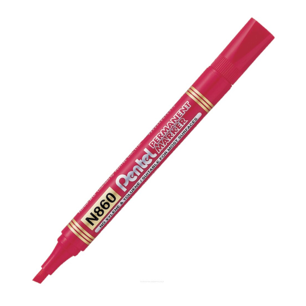 Pentel N860 er en alkoholbaseret vandtæt og hurtigttørrende permanent tusch med plastikhus og skåret holdbar fiberspids med skrivebredde på 1,8-4,2 mm, der holder formen selv efter længere tids brug. Holdbar fiberspidspen med hurtig tørretid, fremragende til træ, papir, plastik, jern, metal, metalplader, pap, pap osv. Xylenfri. Beregnet til både indendørs og udendørs brug med lang holdbarhed i krævende miljøer. Kvalitets- og miljøcertificeret i henhold til ISO 9001 og 14001.