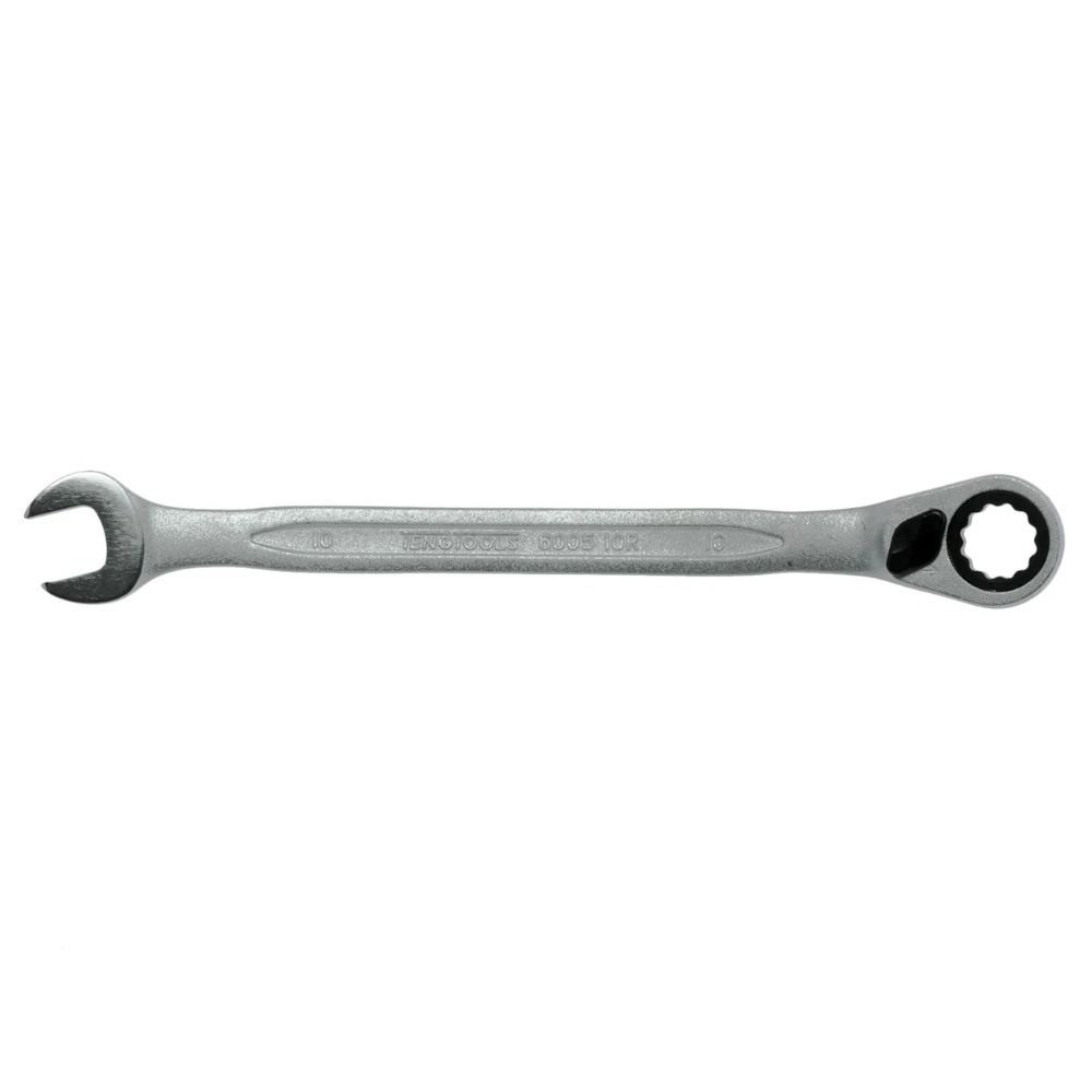 U-ring skraldenøgle lavet af kromvanadiumstål. Kombineret bloknøgle og 12-punkts ringskraldenøgle. Skraldenøglefunktionen kan indstilles til højre- eller venstregående træk. 12-punkts ringhovedet er bøjet i en 15° vinkel. Samme nøglebredde i begge ender. Matforkromet.