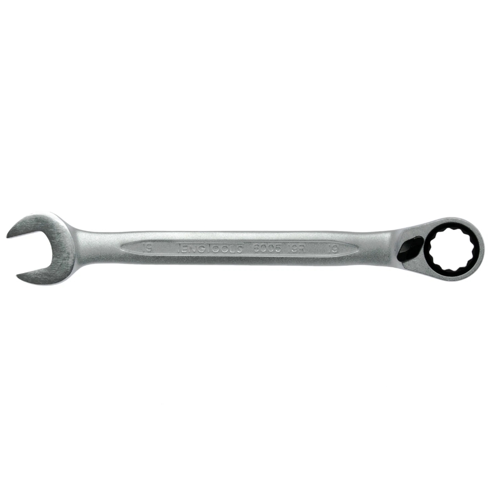U-ring skraldenøgle lavet af kromvanadiumstål. Kombineret bloknøgle og 12-punkts ringskraldenøgle. Skraldenøglefunktionen kan indstilles til højre- eller venstregående træk. 12-punkts ringhovedet er bøjet i en 15° vinkel. Samme nøglebredde i begge ender. Matforkromet.
