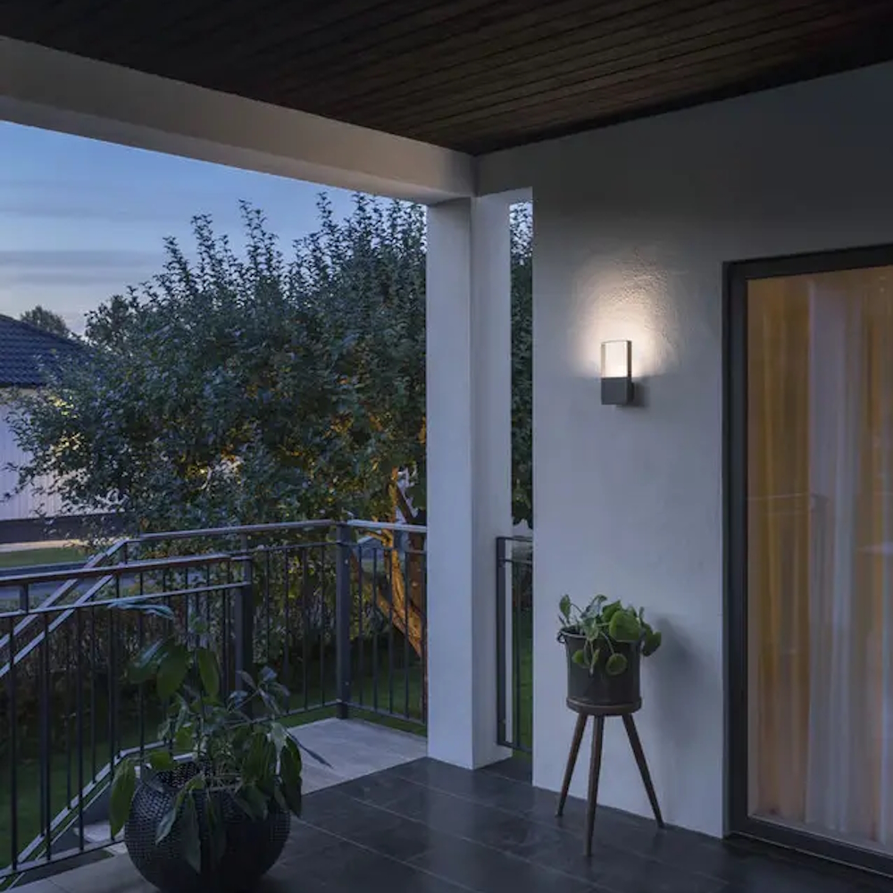Matera facadebelysning i antracitgrå malet aluminium og frostet akrylglas er en moderne armatur.