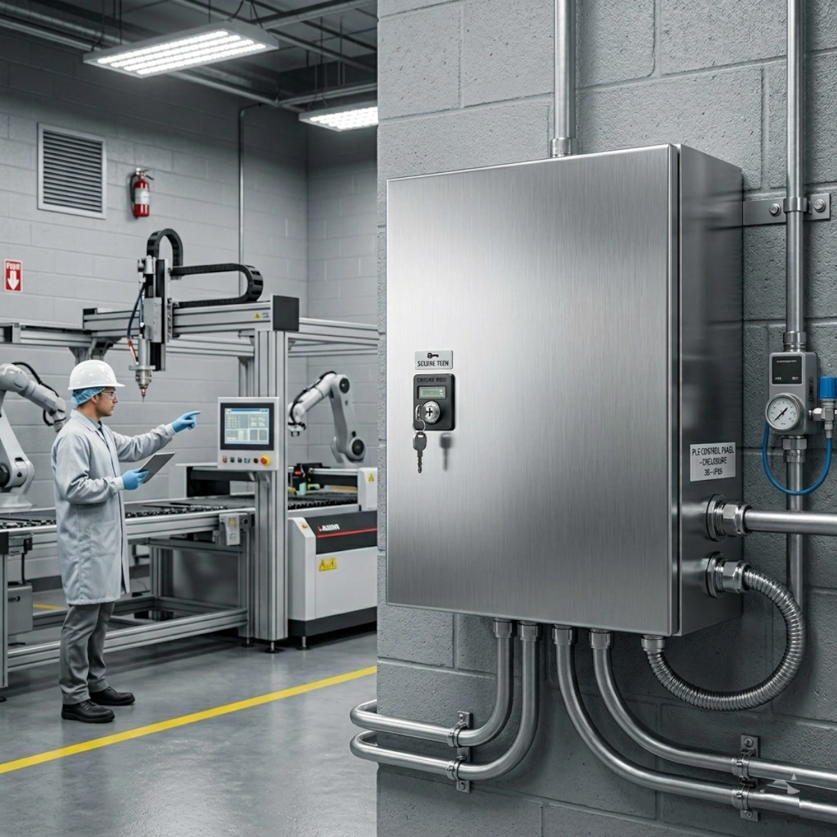 Køb vægskab i rustfrit stål et fleksibelt apparatskab med vendbar dør og galvaniseret montageplade, Høj kvalitet til barske miljøer.