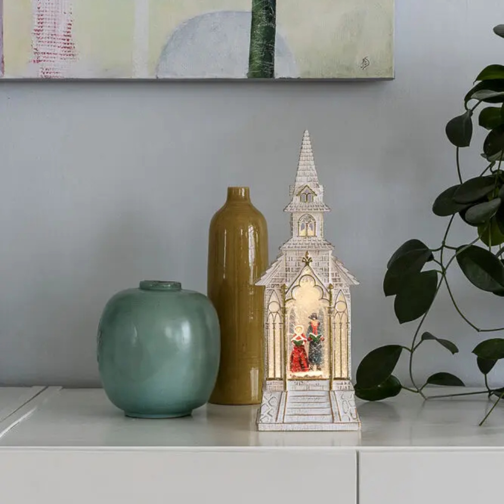 Vandfyldt lanterne formet som en kirke, udstyret med hvid LED-belysning og har en 5-timers timer, drevet af 3 LR14/C batterier.