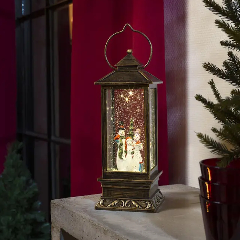 Lanterne med snekugleeffekt. Snemand i hvirvlende glimmer, varm hvid LED og 5-timers timer. Drevet af 3xC batterier (medfølger ikke).