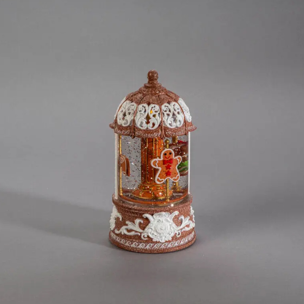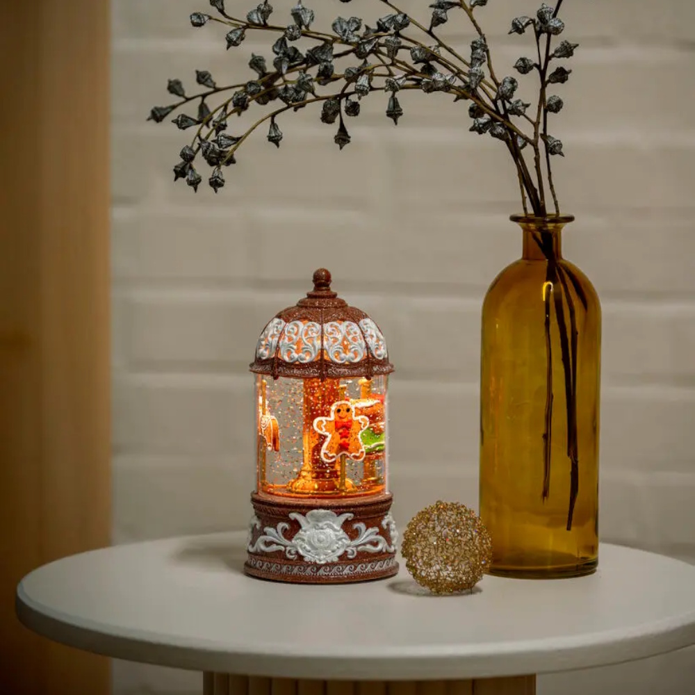 Peberkagehus med roterende karrusel. En vandfyldt snekugle med glade peberkagemænd og hvirvlende glimmer. Det varmhvide LED-lys oplyser huset og skaber en hyggelig julestemning. Perfekt i din julelandsby eller som bordpynt. Med en indbygget timerfunktion (5t) og mulighed for både batteri- og USB-drift er det nemt at sprede julemagi - dag efter dag.