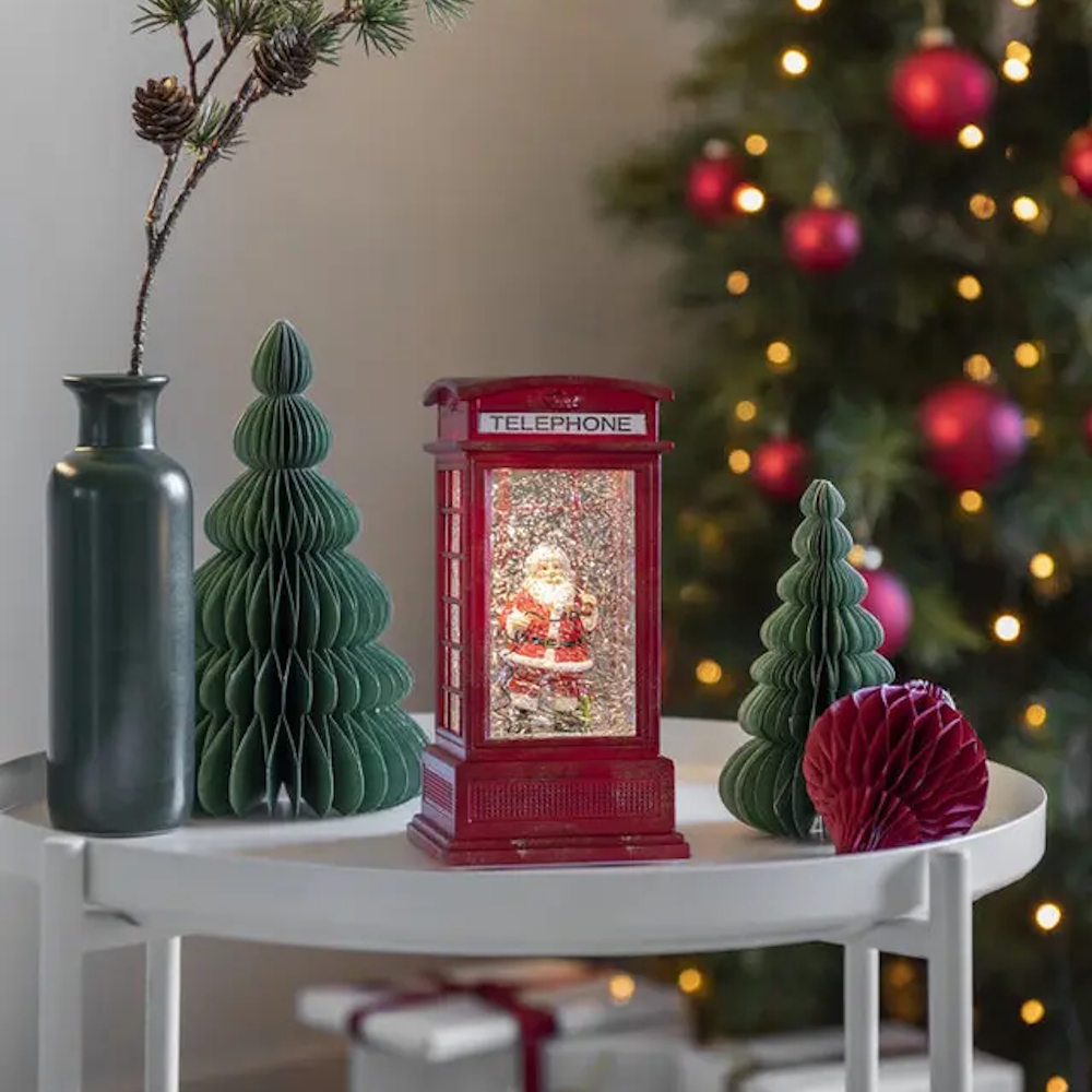 Festlig juledekoration i form af en julemand i en telefonboks, fyldt med vand og detaljerede figurer. Glimmeret hvirvler rundt som i en snekugle og skaber en magisk julestemning. Med varm hvid LED-belysning, timerfunktion (5 timer) og drevet af 3stk AA-batterier (medfølger ikke).