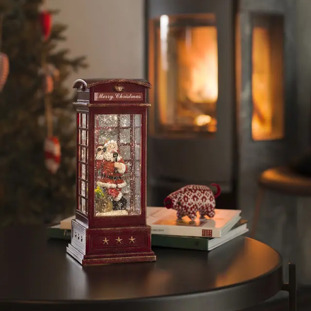 Festlig juledekoration i form af en julemand i en telefonboks, vandfyldt med detaljerede figurer. Glimmeret hvirvler rundt som i en snekugle og skaber en magisk julestemning. Med varm hvid LED-belysning, timerfunktion (5 timer) og drevet af 3xAA-batterier (medfølger ikke).