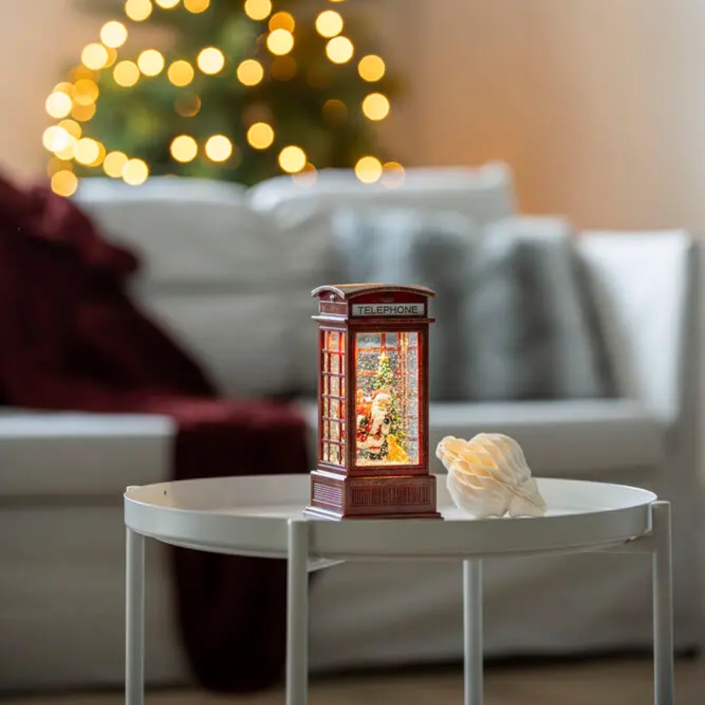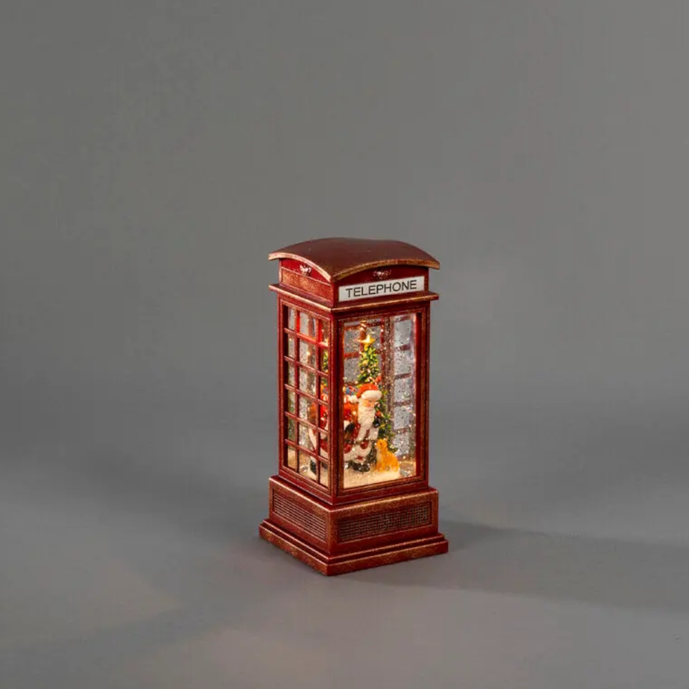 Festlig juledekoration i form af en julemand i en telefonboks, vandfyldt med detaljerede figurer. Glimmeret hvirvler rundt som i en snekugle og skaber en magisk julestemning. Med varm hvid LED-belysning, timerfunktion (5 timer) og drevet af 3xAA-batterier (medfølger ikke).