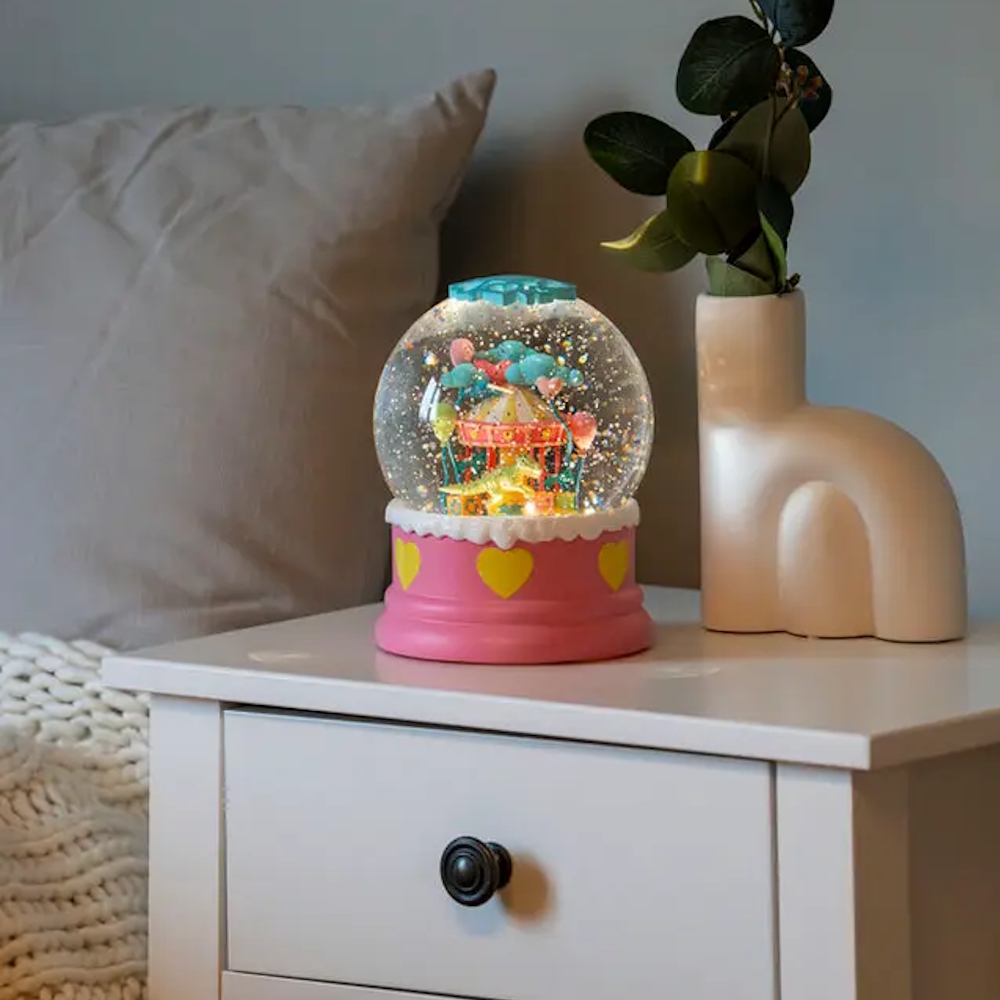 Snekugle med karrusel og dinosaur, omgivet af balloner, skyer og hvirvlende glimmer. Varm hvid LED og 5 timers timer. Drevet af 3xAAA-batterier (medfølger ikke) eller USB.