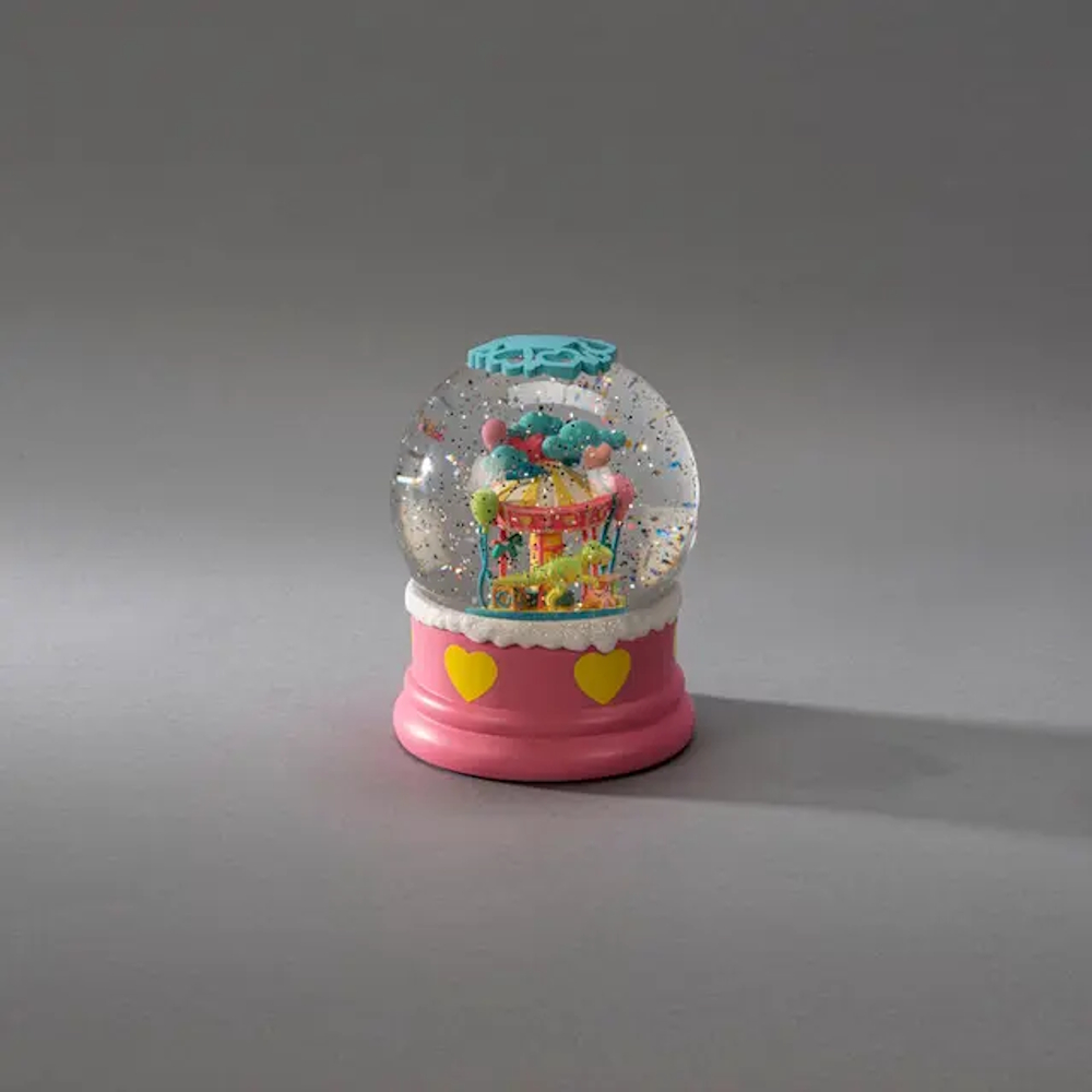 Snekugle med karrusel og dinosaur, omgivet af balloner, skyer og hvirvlende glimmer, varm hvid LED og 5 timers timer.