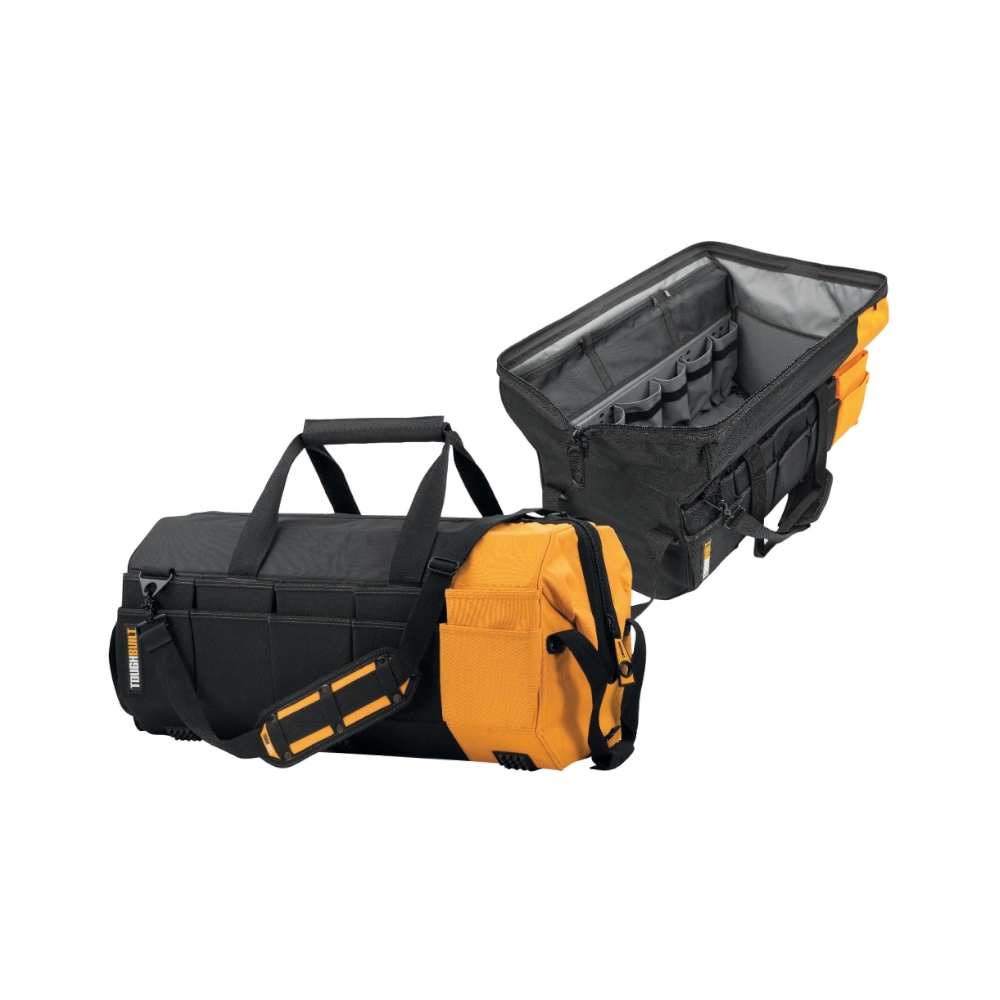 ToughBuilt 66cm Massive Mouth Fanatic værktøjstaske går ikke på kompromis med ekstreme belastninger og kan rumme de fleste ting. Den patentanmeldte åbning er virkelig bred for optimal tilgængelighed. Leveres med en polstret skulderrem, stålforstærkede håndtag for et stærkt tohåndsgreb og ekstra sidehåndtag til at bære de tungeste belastninger. Unik ottekantet form med stiv HardBody-plastforing beskytter alt indeni og holder formen.
