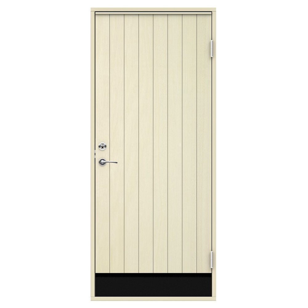 clever-line 18⁰ varm opbevaringsdør med udvendig sparkeplade, der har isolering og skal bruges til opbevaring eller garager med begrænset opvarmning. Døren er beklædt med birkekrydsfiner og har en rillet yderside og en glat inderside. Dør og karm skal behandles umiddelbart efter montering, enten med pigmenteret olieglasur eller heldækkende maling. Der kan forekomme mindre ujævnheder i overfladen.