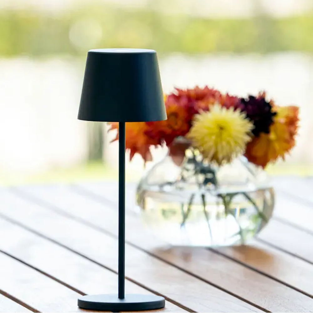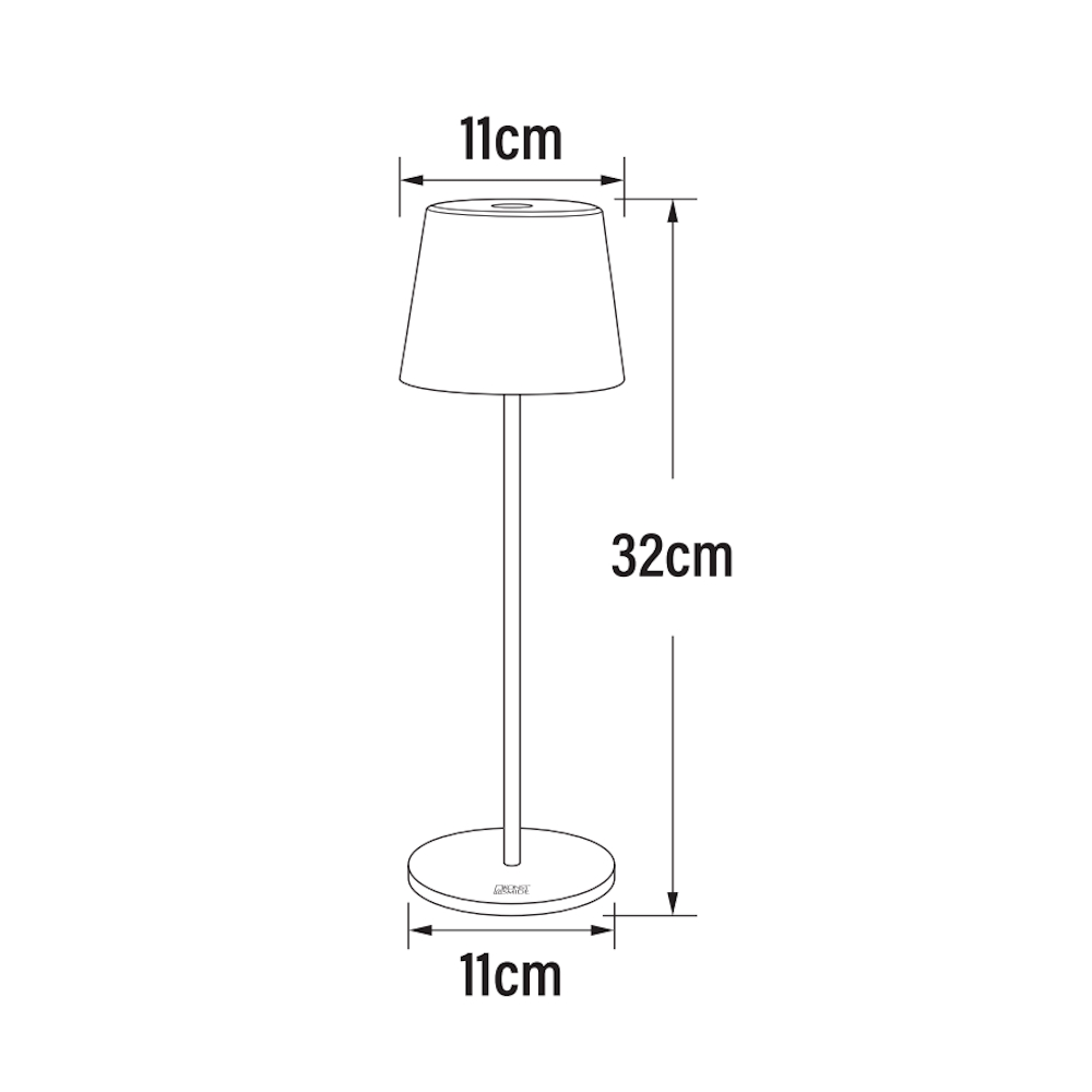 Vence er en bærbar, genopladelig loungelampe med en farvetemperatur på 2700K. Den er dæmpbar og er perfekt som borddekoration på terrassen eller i markisen. Oplades via USB og har en batterilevetid på mindst 7 timer ved fuld lysstyrke. Tænd/sluk-knap øverst på skærmen.