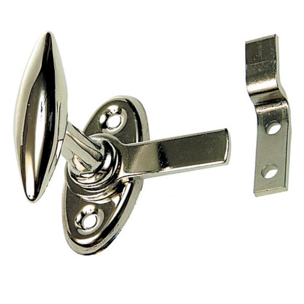 Vinduesknop i forniklet messing, leveres med 7 mm krog til flad montering, knoplængde 40 mm.