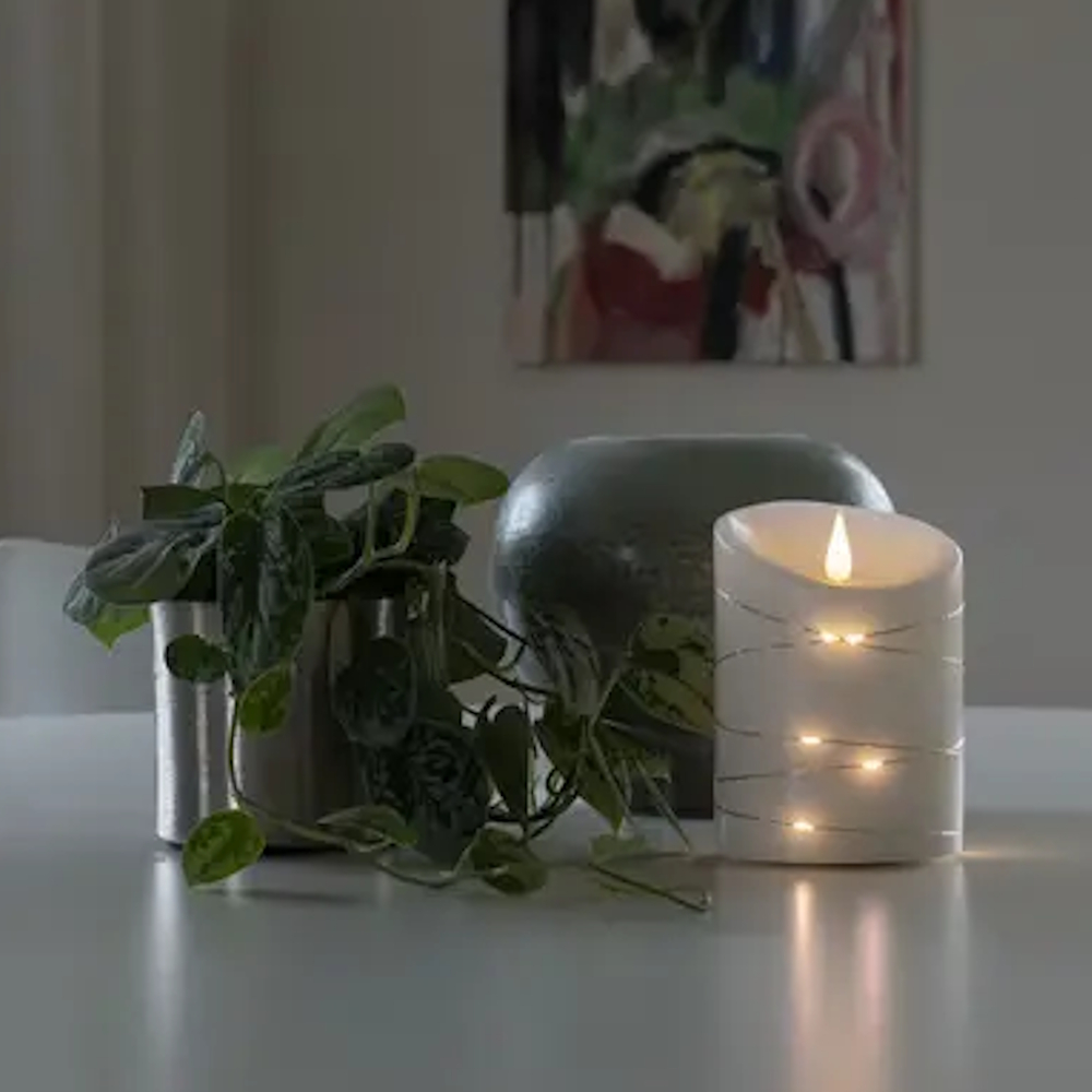 Dette cremehvide batterilys er dekoreret med en funklende mikro-LED-snor, en ekstra realistisk flamme, der giver en magisk effekt.