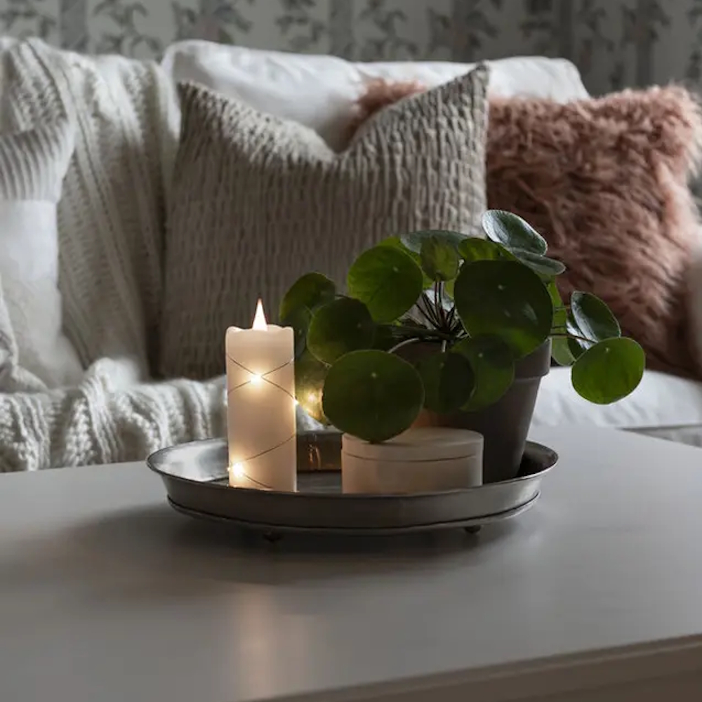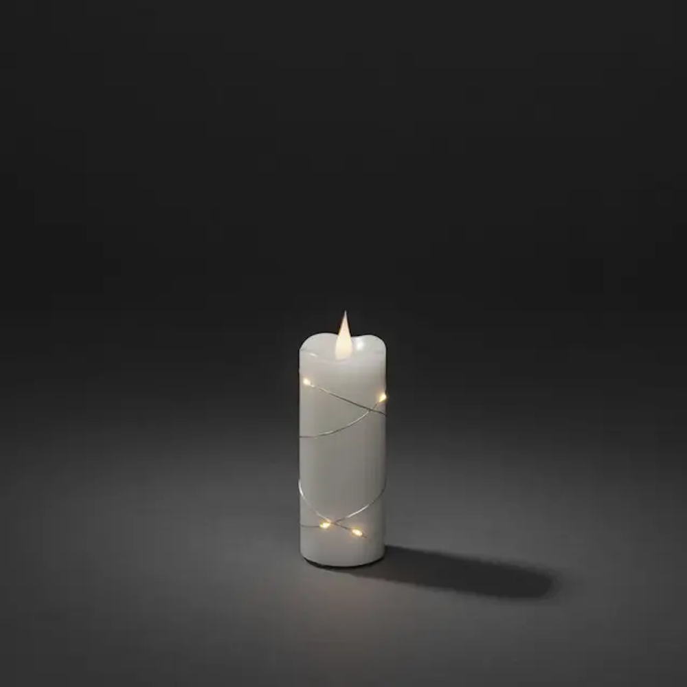 Vokslys i hvid med varm hvid mikro-LED-strip og lys, drevet af 2xAA-batterier, timerfunktion på 4 eller 8 timer.