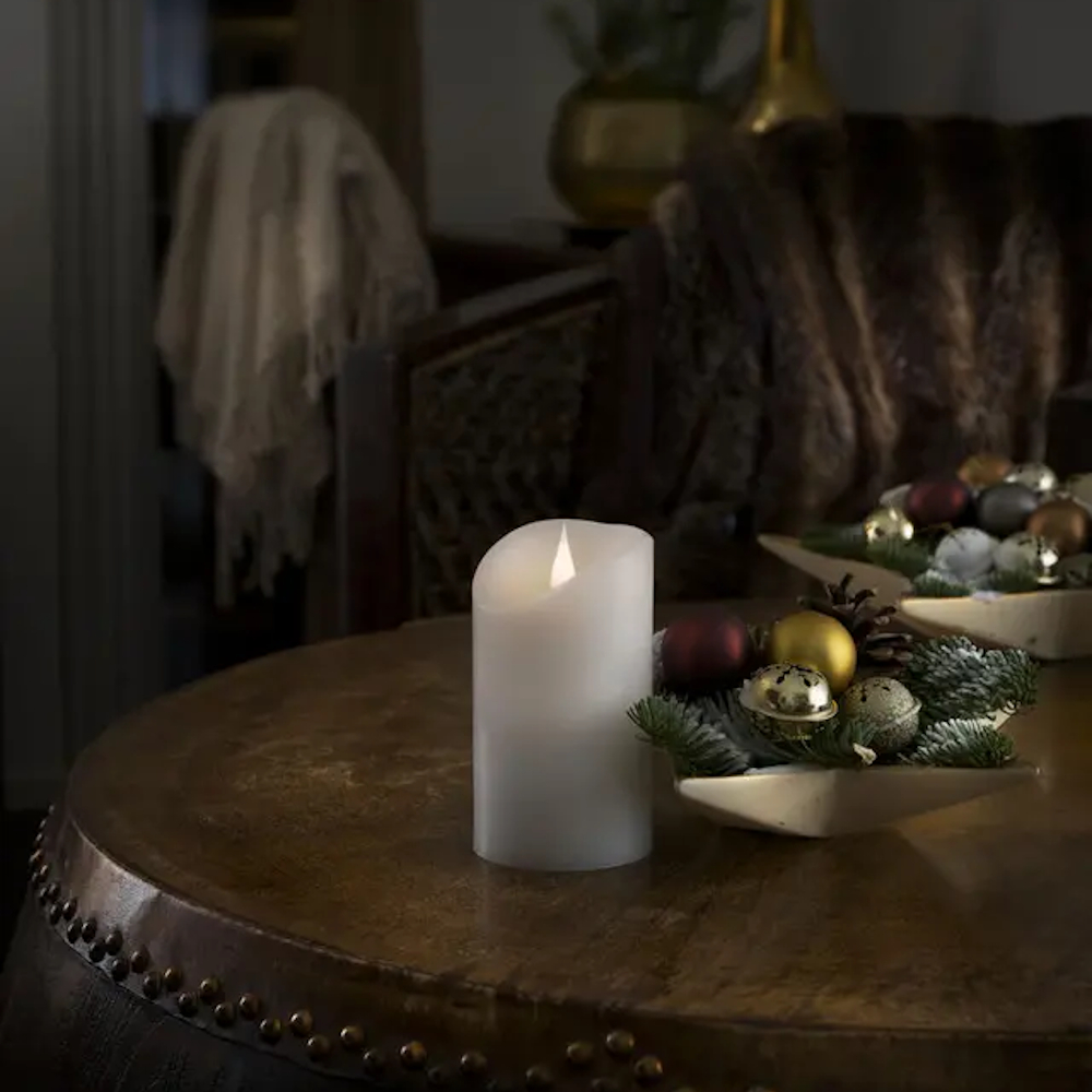 Vokslys i hvid farve med varm hvid LED. Pynt en borddækning eller skab en hyggelig atmosfære. Drevet af 2xC batterier (medfølger ikke). Timerfunktion på 4 eller 8 timer.