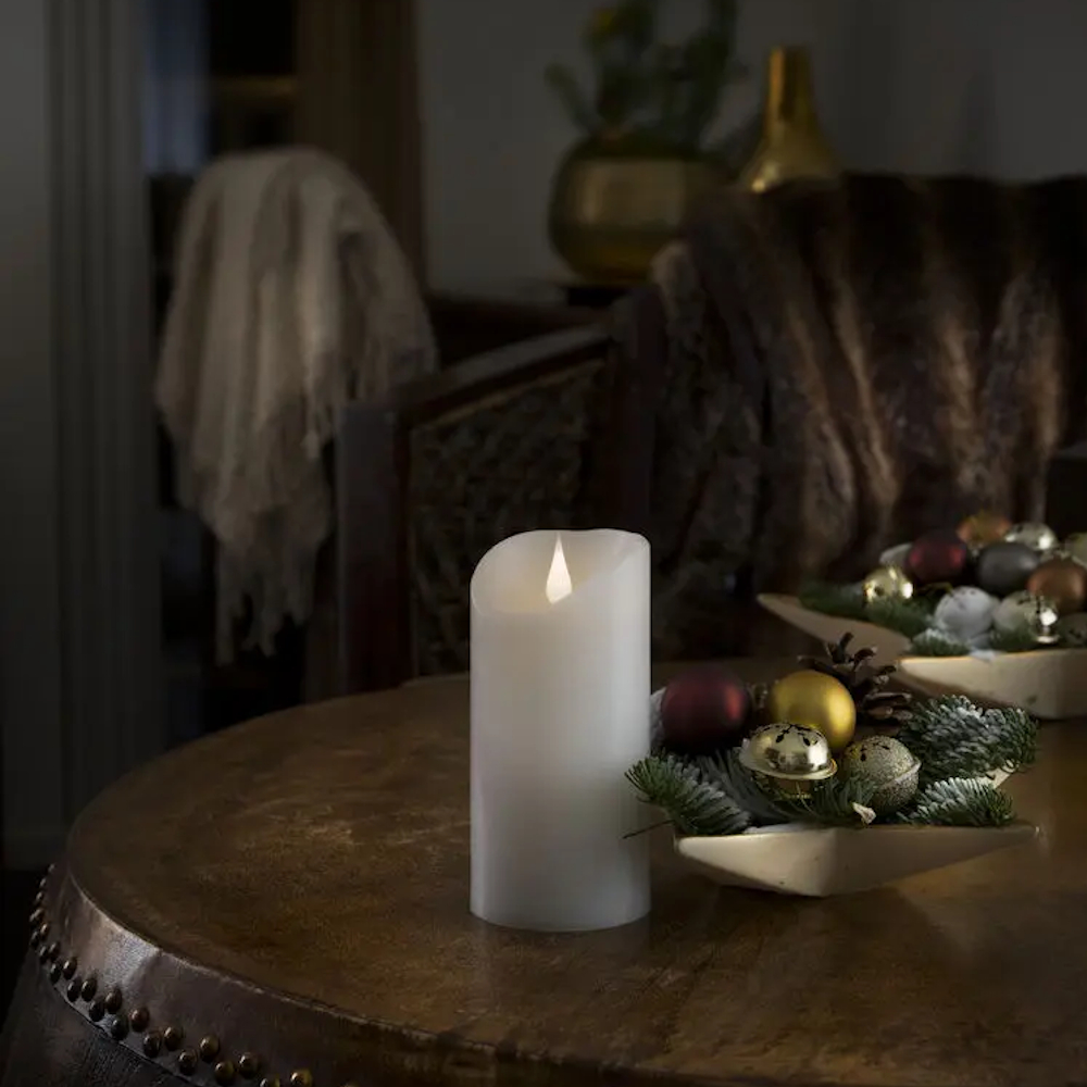 Vokslys i hvid farve med varmt hvidt LED-lys. Pynt en borddækning eller skab en hyggelig atmosfære. Drevet af 2xC batterier (medfølger ikke).