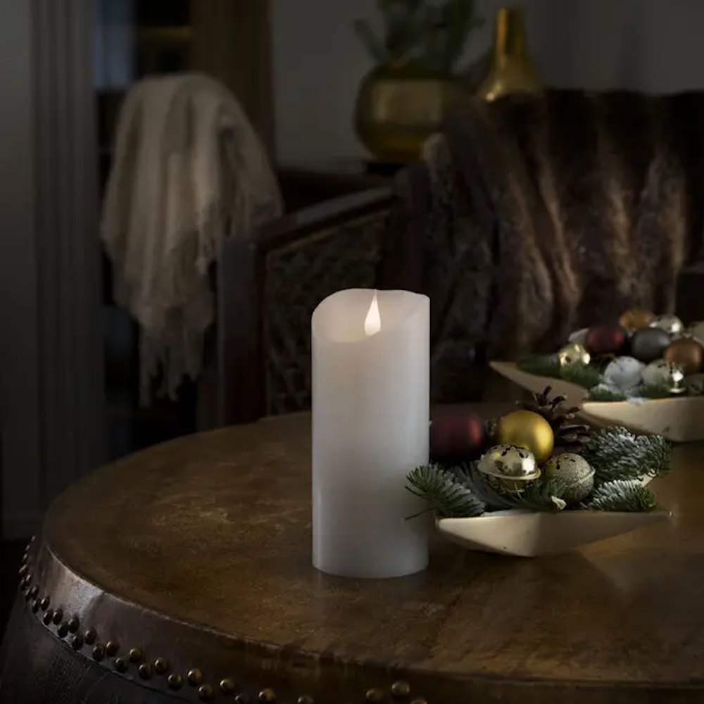 Vokslys i hvid farve med varmt hvidt LED-lys. Pynt en borddækning eller skab en hyggelig atmosfære. Drevet af 2xC batterier (medfølger ikke).
