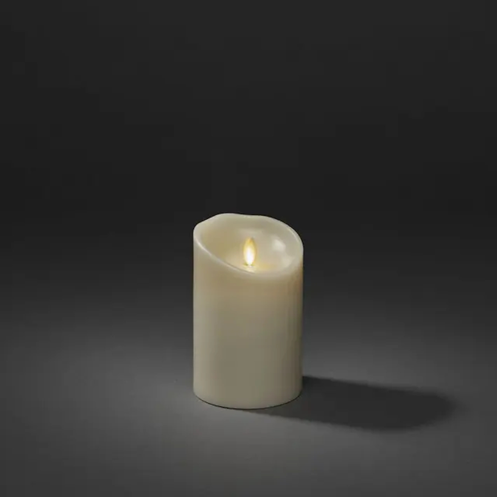 Cremehvidt vokslys til indendørs brug med varm hvid LED. Drevet af 2xLR14/C batterier. Har bevægelig flamme og indbygget timer på 5 timer.